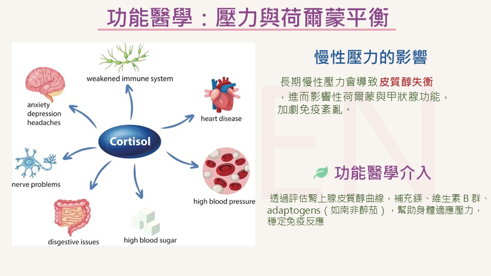 - 慢性壓力會導致皮質醇失衡,影響性荷爾蒙與甲狀腺功能,