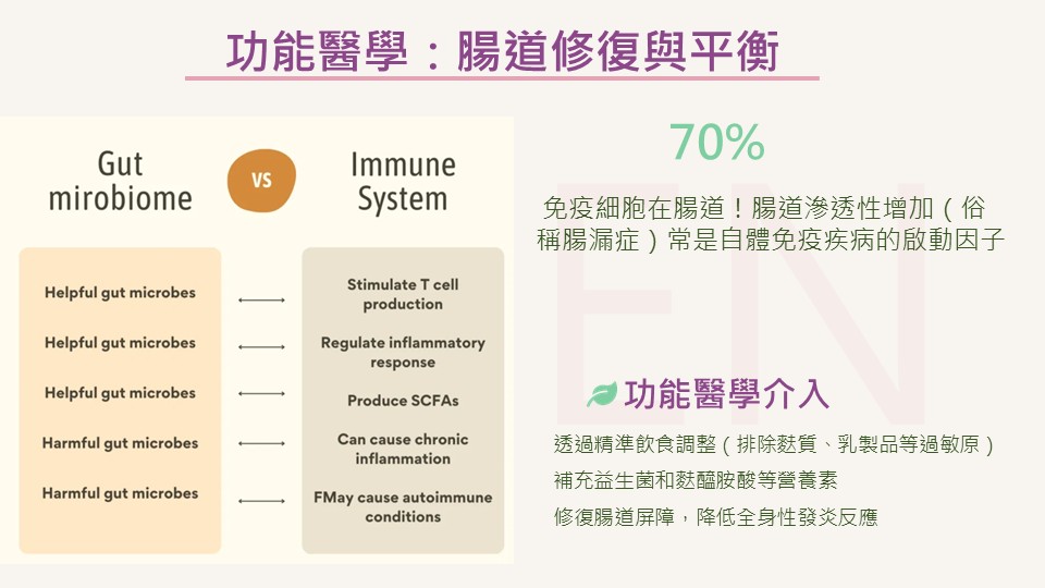 - 腸漏(腸道滲透性增加)常是自體免疫的啟動因子。