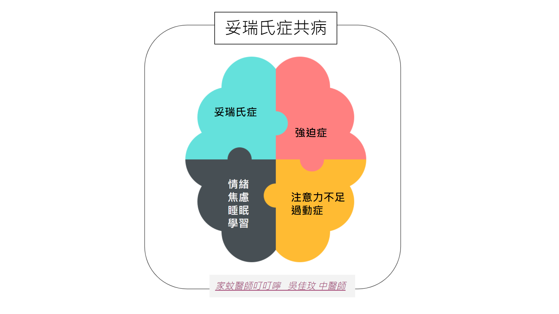 只是妥瑞氏症也常合併其他疾病需要我們注意,像是注意力不足過動症、強迫症、焦慮憂鬱、學習障礙、睡眠問題等。我們稱為共病,意思是醫學上觀察到這幾種疾病常出現在同一個人身上,但並不是因為一個病沒治療或其他原因所以引發另一個病,家長勿須自責。其中強迫症與妥瑞氏症可能兩者都是在皮質-下視丘迴路的傳遞上出現了問題,因此而產生共病。其他與妥瑞氏症共病的原因尚不明。
