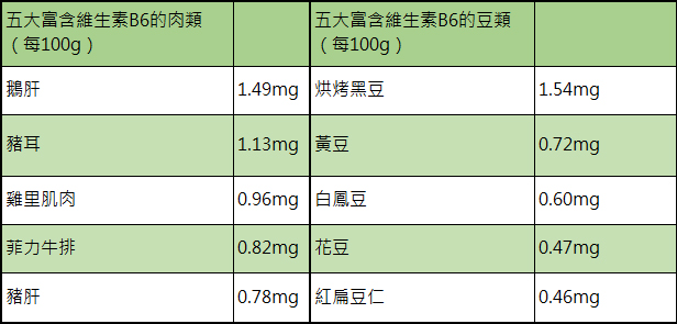 維生素B6最適合與優質蛋白質食物的食物搭配,像是肉品、大豆製品等,因為維生素B6也能幫助體內的胺基酸代謝,因此,攝取足夠的優質蛋白質,再搭上維生素B6的營養,就能讓媽媽們得到豐富的蛋白質營養。