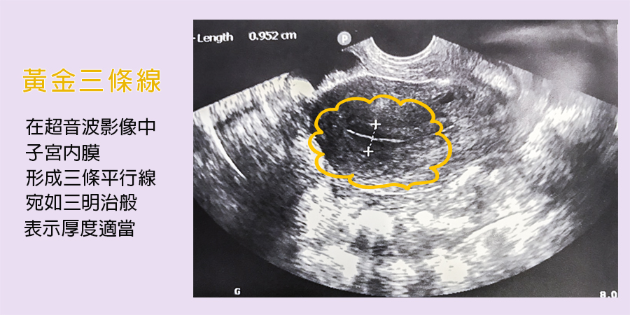 想要胚胎順利著床,內膜厚度要好、型態也要好。當女性排卵期來臨,子宮的內膜厚度增為9-10mm是最佳胚胎著床厚度;在型態上,隨著排卵期來臨,雌激素上升與卵泡的增長,內膜開始增厚,則會形成「黃金三條線」(在超音波影像下),是最佳的胚胎著床環境。