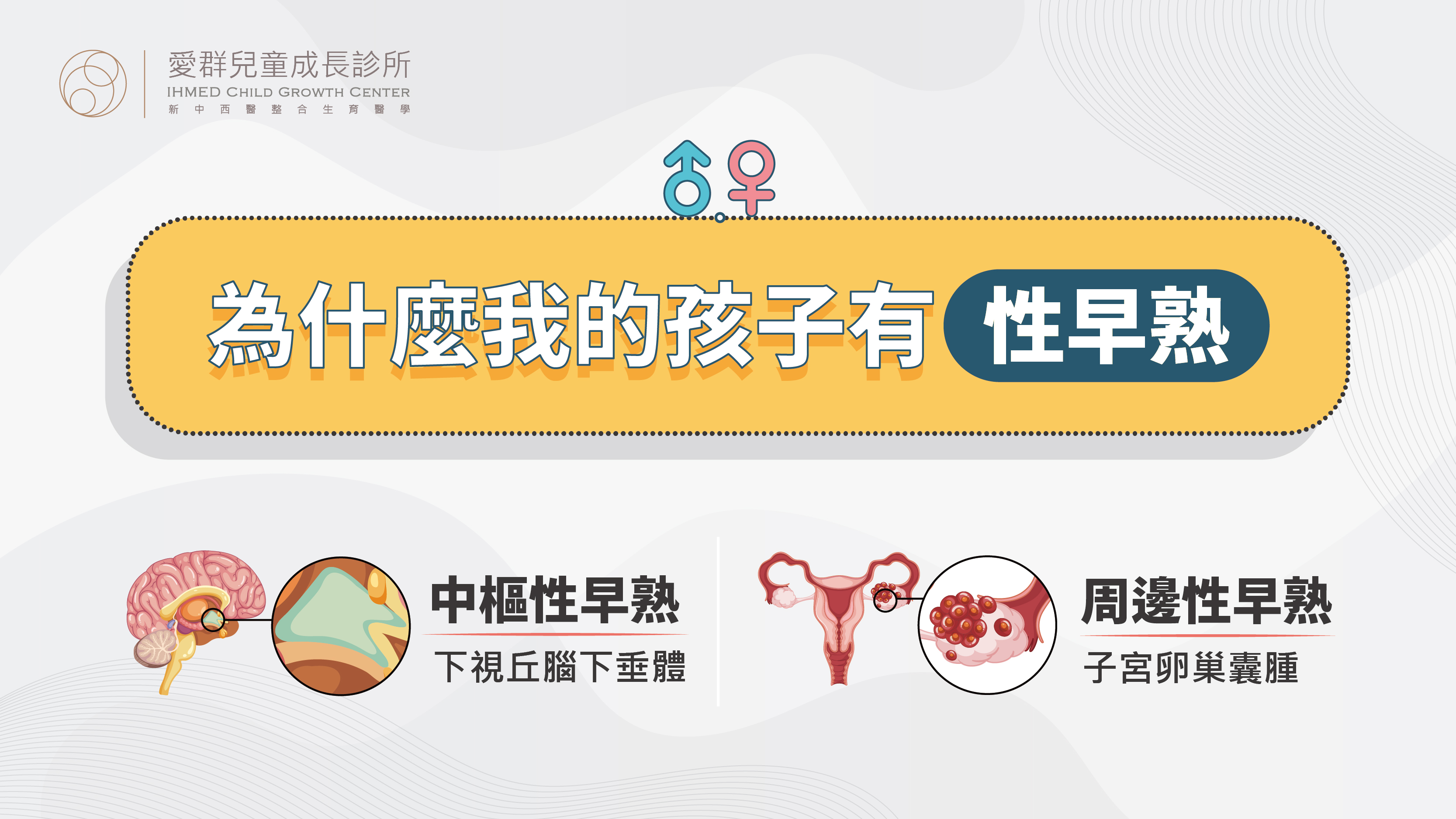 1、中樞型性早熟:屬於真實性早熟,因下視丘腦下垂體性線系統提早被活化所致,造成性腺提早成熟及第二性徵提早發育。