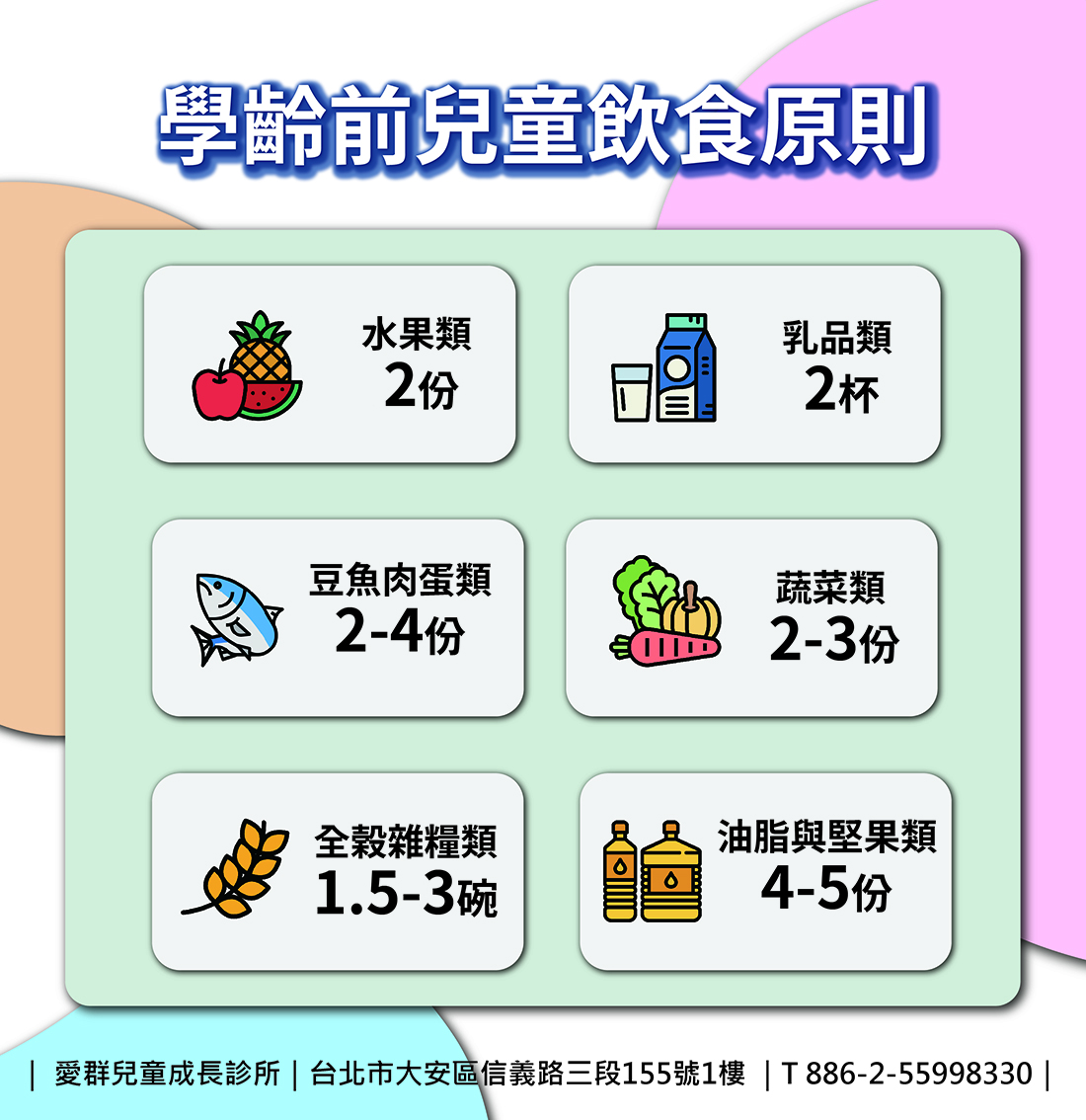 2-6歲學齡前階段是建立就學後飲食模式(營養食物)及健康生活模式(運動)的最好時機! 多吃新鮮食材、均衡攝取,藉由提供足夠的營養,來維持學齡前兒童的生長發育及活動量所需,幼兒不須堅持只吃三餐的社會習慣 吃甚麼內容比甚麼時候吃 來得更為重要 !多次的正餐及點心要符合兒童的營養及熱量需求,並且能維持血糖濃度以支持快速發育的腦及神經系統,早餐和點心尤其重要。