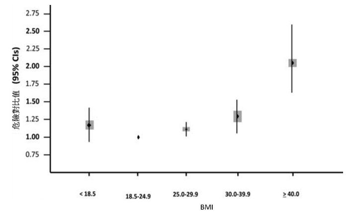 圖一、身體質量指數(BMI)和發生無精子症/精子過少的危險對比值(odds ratio)