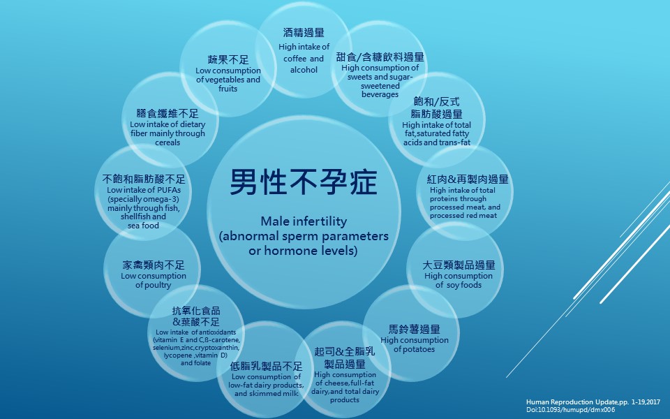 本系列文章主要是針對各種常見飲食對精蟲品質影響做探討(圖示一),飲食是每天必要的生理過程,但也是最容易去被忽略的地方,我們需要攝取足夠的營養成分來維持身體基本機能和健康,但是如果我們時常吃一些不健康的食物,相對的也會影響我們的身體功能,其中當然也包括精蟲品質負面的影響。看到這裡或許有讀者會認為說,會不會看了文章內容後就會沒有什麼“好吃”的食物可以吃了? 事實上筆者所想要強調是,飲食習慣的改善是一種長期過程,非一朝一夕可完成。需要有堅定的意志力、妥善規劃、也需要家人的協助配合。好吃但不健康的食物不是完全不能吃,是要有技巧的吃。