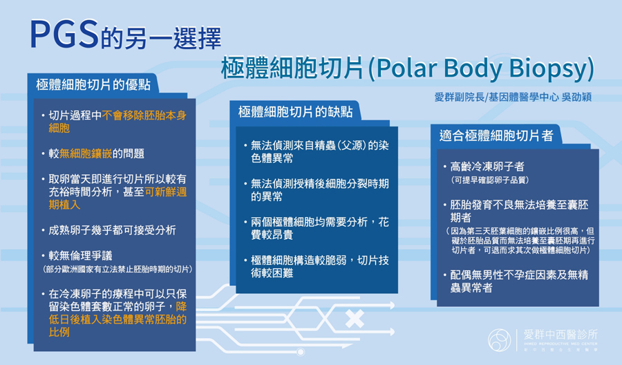 - 胚胎發育不良無法培養至囊胚期者: 因為第三天胚葉細胞的鑲嵌比例很高,但礙於胚胎品質而無法培養至囊胚期再進行切片者,可退而求其次做極體細胞切片。