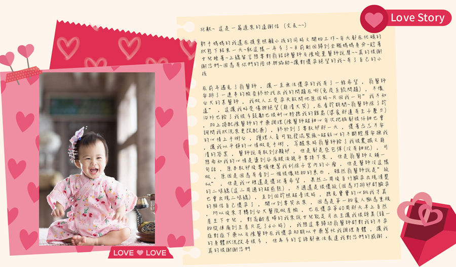對高齡產婦的我來說,女兒能足月出生讓我很訝異(頭一胎從陣痛到生產只花了4小時),我想這要歸功翁醫師針對我的不孕症對症下藥以及陳醫師在我懷孕初期以中藥幫忙我調理身體,讓我的身體狀況改善很多,但再多的言語都無法表達我對您們的感謝,真的很謝謝您們~