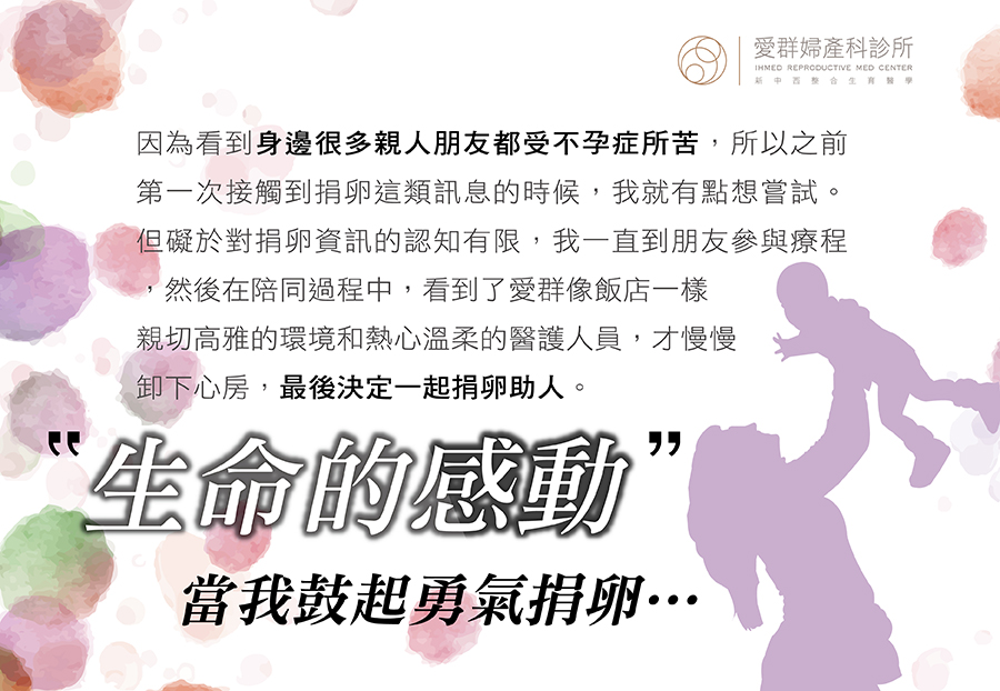 因為看到身邊很多親人朋友都受不孕症所苦,所以之前第一次接觸到捐卵這類訊息的時候,我就有點想嘗試。但礙於對捐卵資訊的認知有限,我一直到朋友參與療程,然後在陪同過程中,看到了愛群像飯店一樣親切高雅的環境和熱心溫柔的醫護人員,才慢慢卸下心房,最後決定一起捐卵助人。